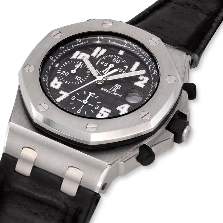 This Audemars Piguet Royal Oak Offshore Chronograph replica watch (model no. 25940SK.OO.D002CA.02) is a perfect 1:1 clone of the original. It features a 904L stainless steel case and bezel, with a sapphire crystal and a black rubber bracelet. The movement is an automatic caliber 2226/2840 with a 60-hour power reserve and a precision of (-3/+3 sec/day) within COSC certification limits. The dial is black with Arabic numerals and 904L stainless steel hour markers and hands.
